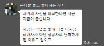 ‘아직 내가 내세울만한 직업이 변변치 않아서 그런 것 같아. 빨리 공부하거나 준비해서, 취업을 하거나 더 좋은 곳으로 이직을 해야지.’