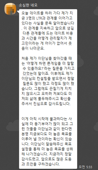 – “지금 몇 명의 이성들과 가까스로 만남과 연락을 이어 나가고는 있는데, 제가 잘하고 있는 건지, 이대로 하다 보면 제가 원하는 연애 라이프를 구축할 수 있을지에 대한 확신이 부족해요.”